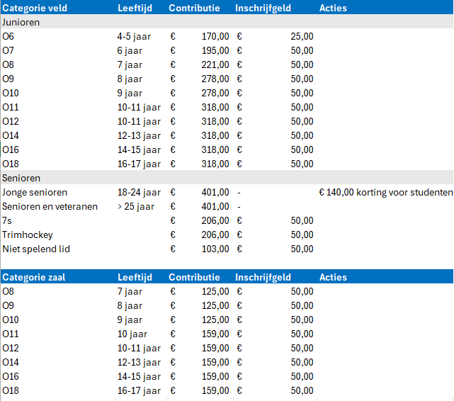 - Inschrijfgeld is eenmalig van toepassing bij inschrijven als lid. Het is ook van toepassing voor nieuwe leden die alleen aan zaalhockey deelnemen.
